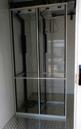 Características: Sistema de içamento, Sistema de climatização com ar condicionado e/ou ventilação forçada, controle e monitoração de temperatura, rack padrão 19”, sensor de abertura de porta, iluminação e fumaça, sistema e monitoração de energia, placas de passagem de cabos, compartimento de gerador e bateria, módulos solares, entre outros.