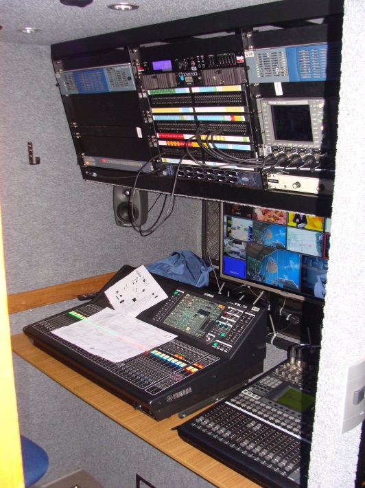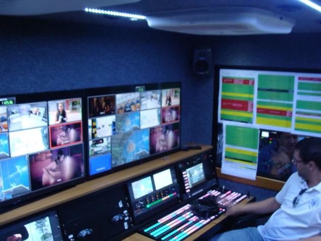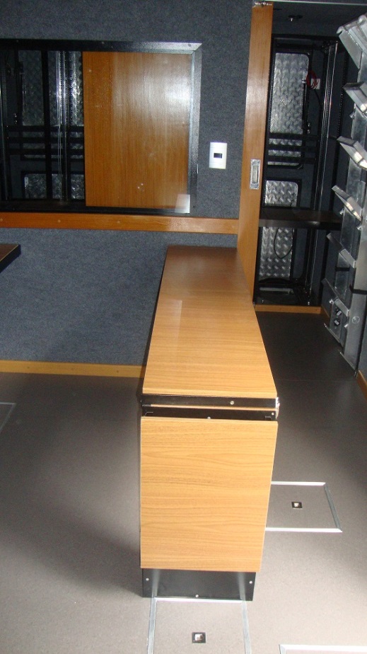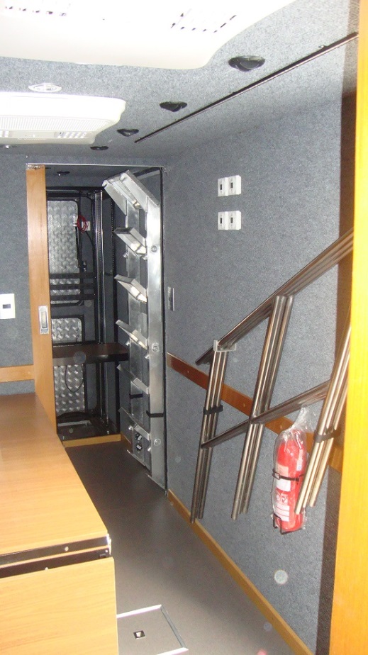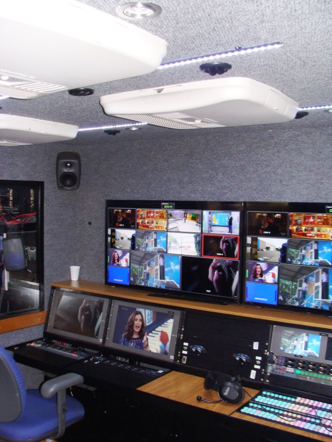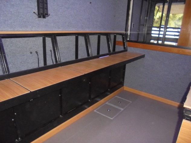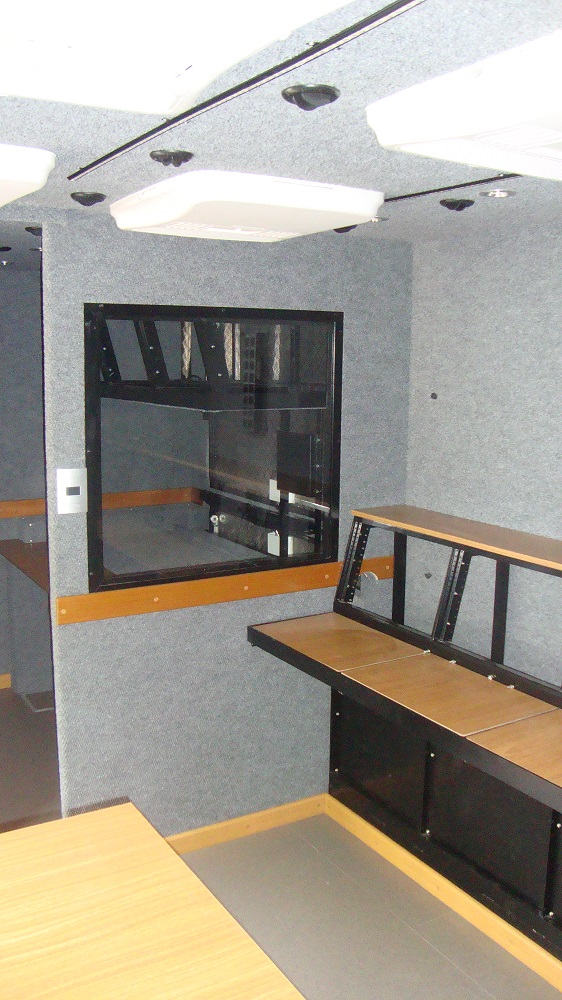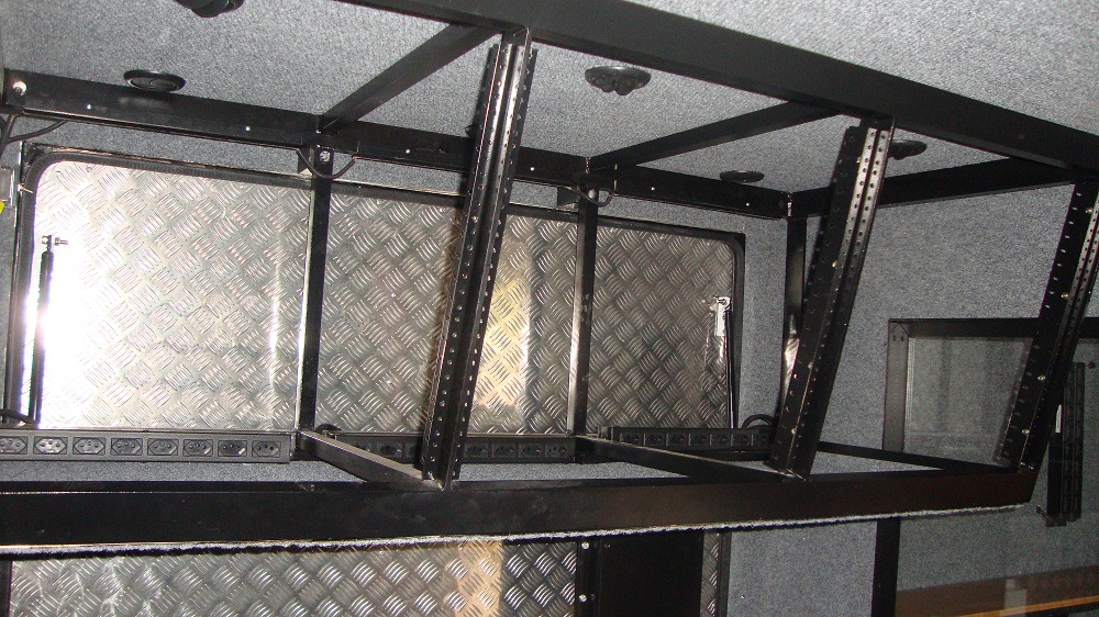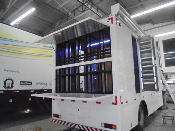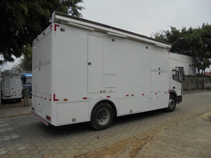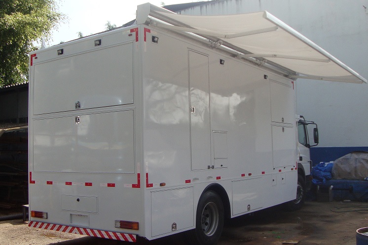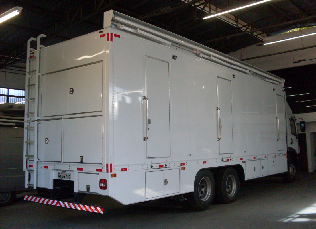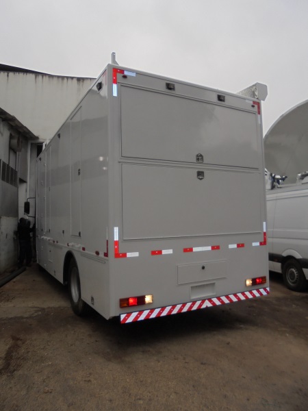 Acabamento interno com isolamento térmico e acústico, rack padrão 19”, gerador de energia, ar condicionado, painel para entrada de sinais e energia, nivelamento hidráulico automático, guarda corpo, carretel de cabos, toldo, entre outros